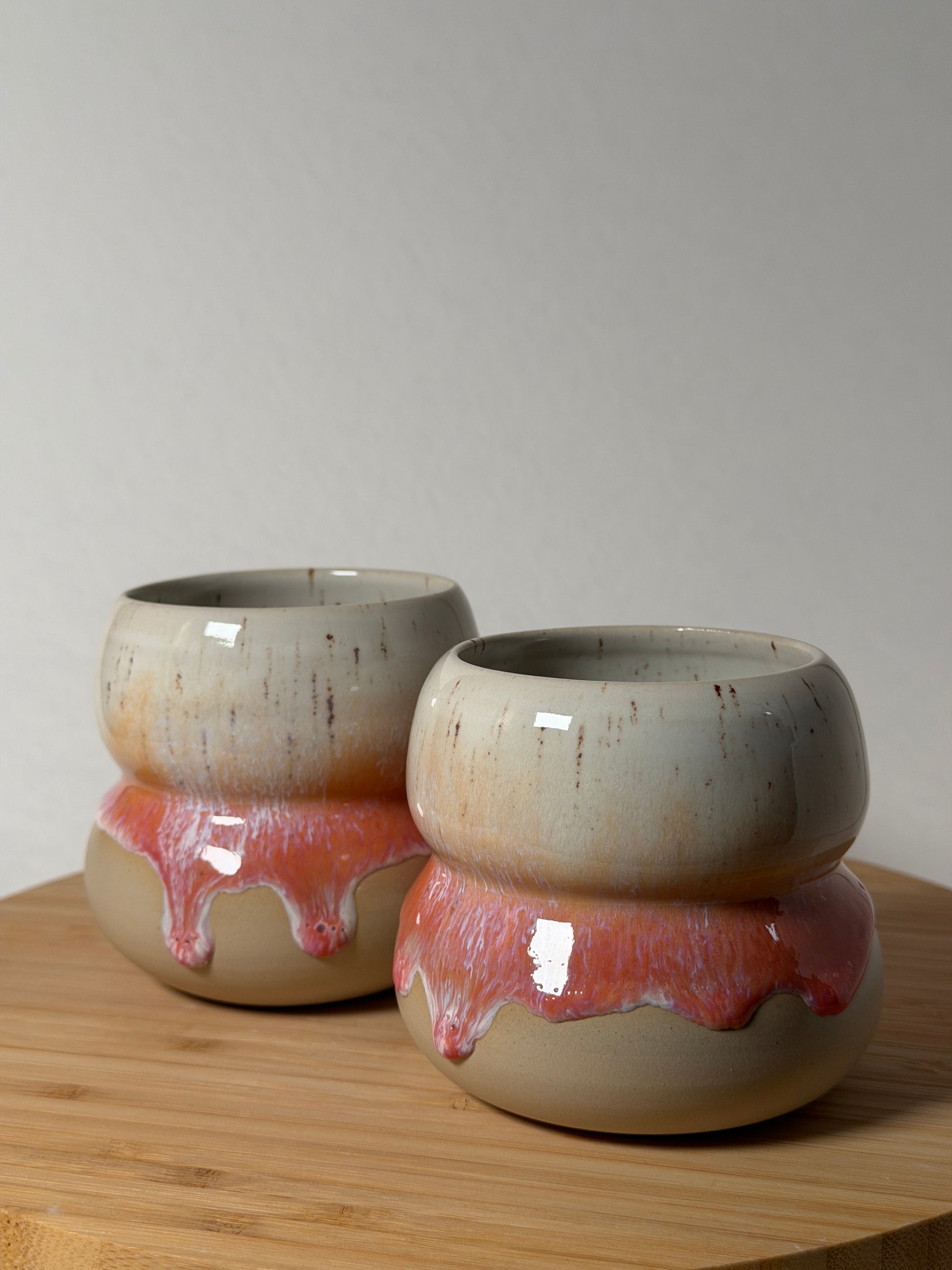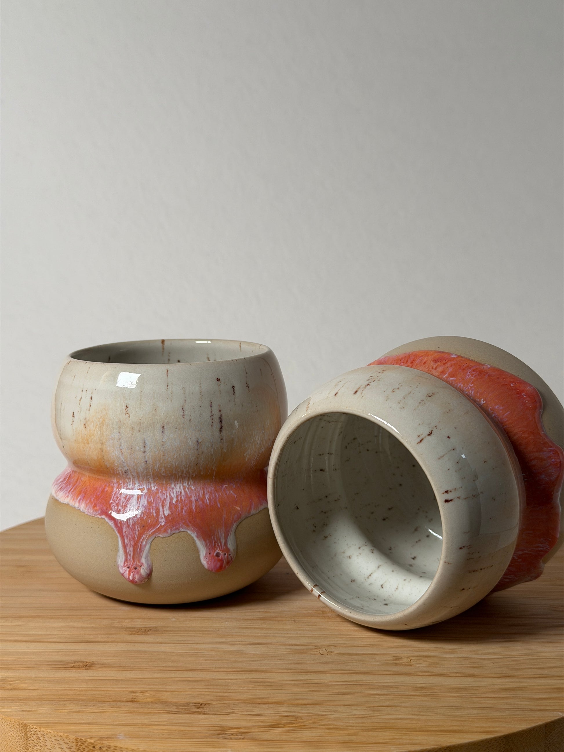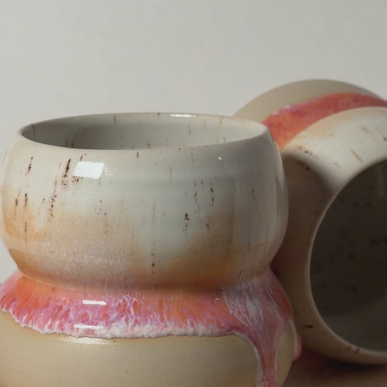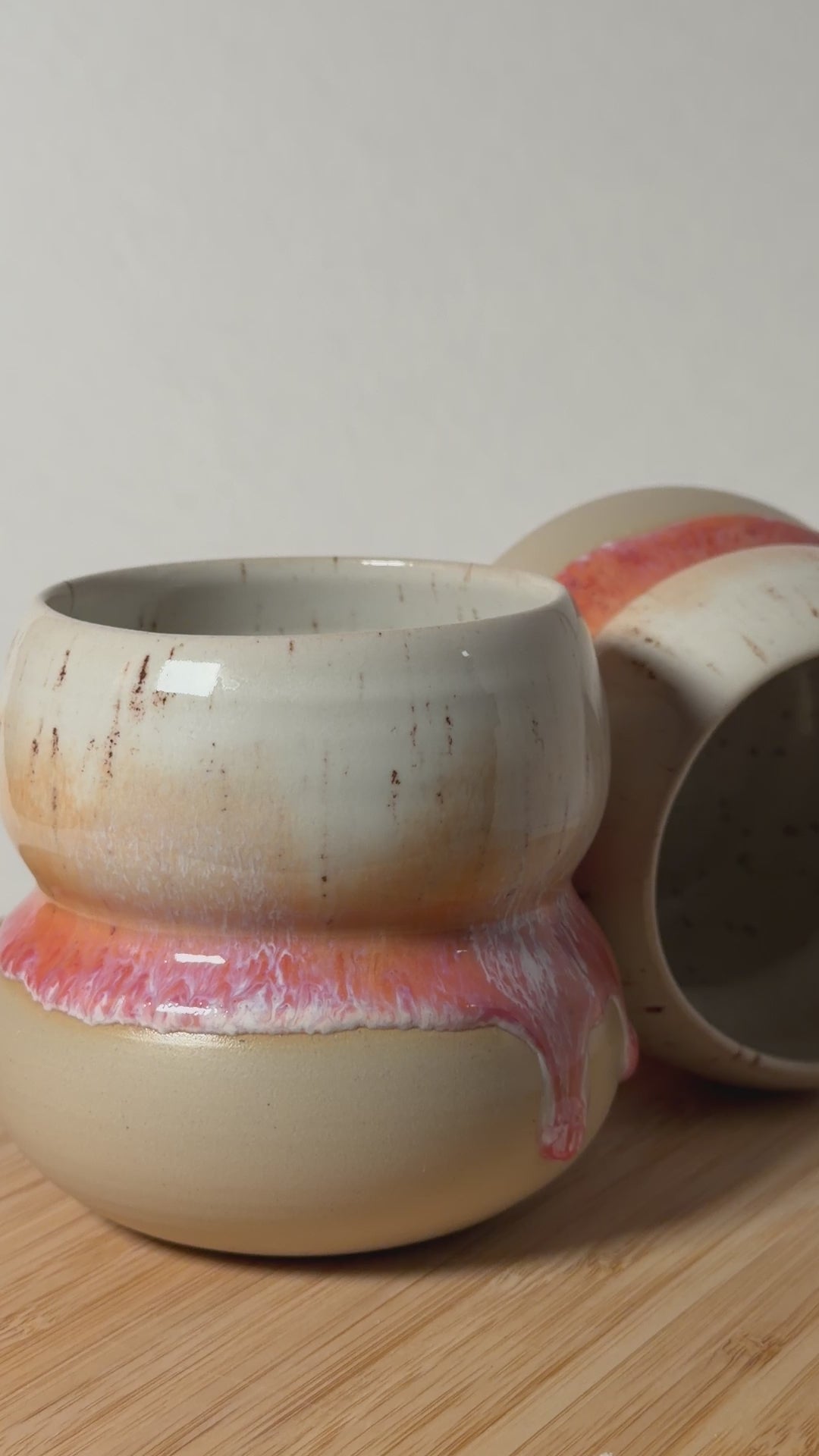 Jeder meiner Bubblebecher wird mit viel Liebe und Sorgfalt auf der Drehscheibe aus hellem Steinzeug gefertigt. Die Glasur in der Farbkombination „Girasole“ vereint warme Gelb- und Rosatöne und erinnert an das Leuchten einer Sonnenblume.