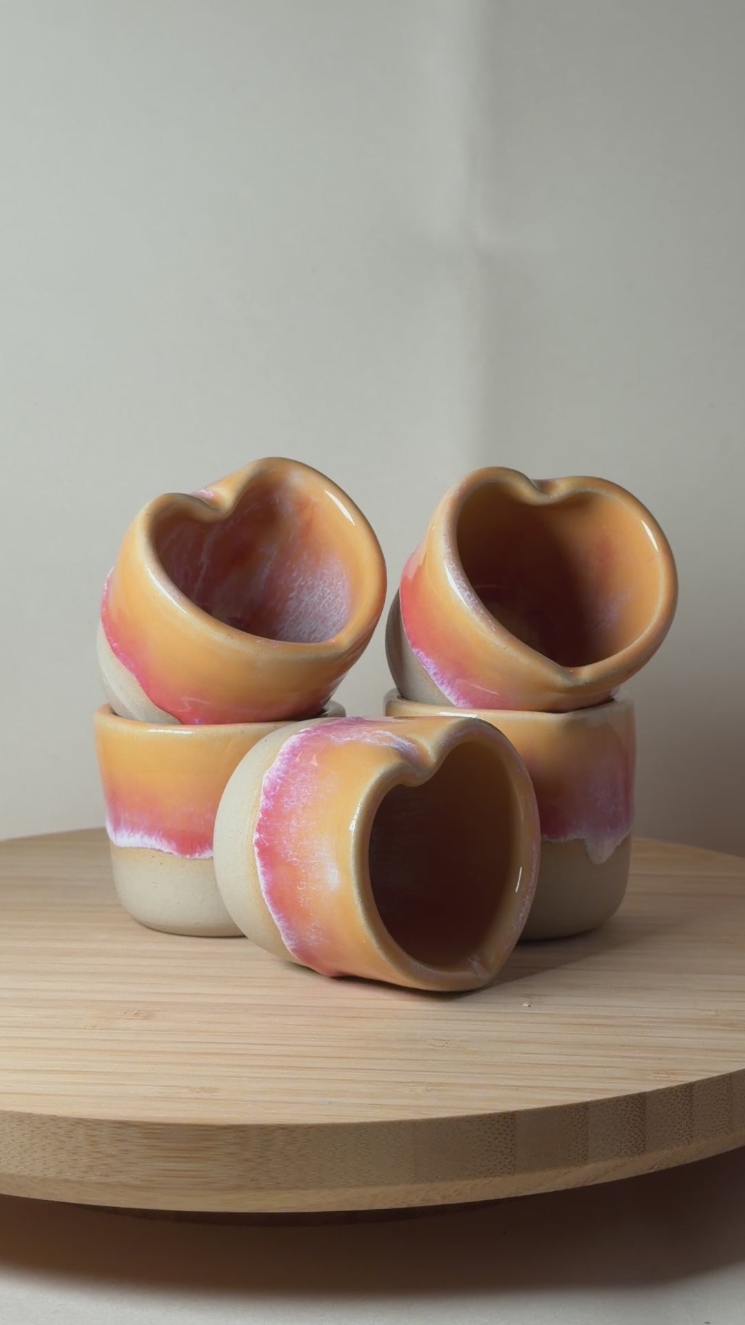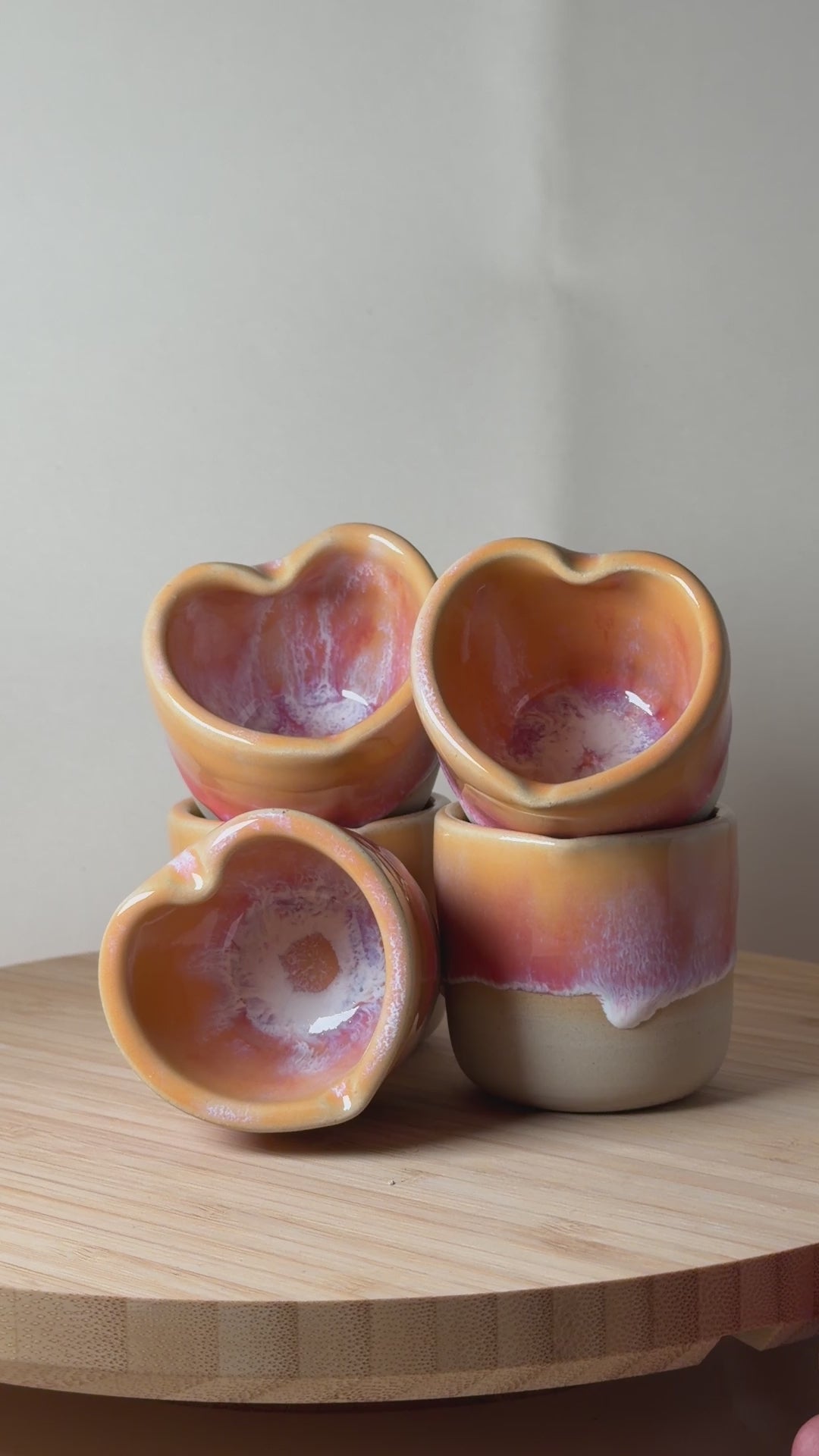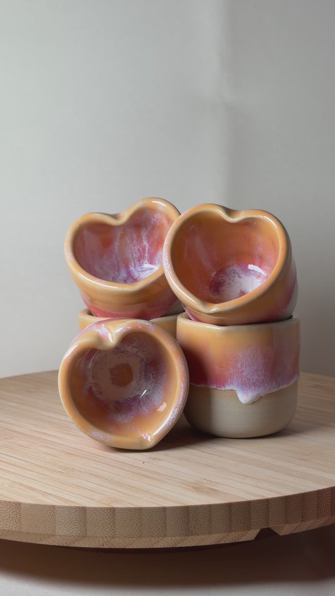 Jeder meiner Espressobecher wird mit viel Liebe und Präzision auf der Drehscheibe aus hellem Steinzeug gefertigt. Die Glasur „Girasole“ strahlt in warmen Gelb- und Rosatönen und erinnert an das Leuchten einer Sonnenblume im Abendlicht – sonnig, verspielt und voller Lebensfreude.