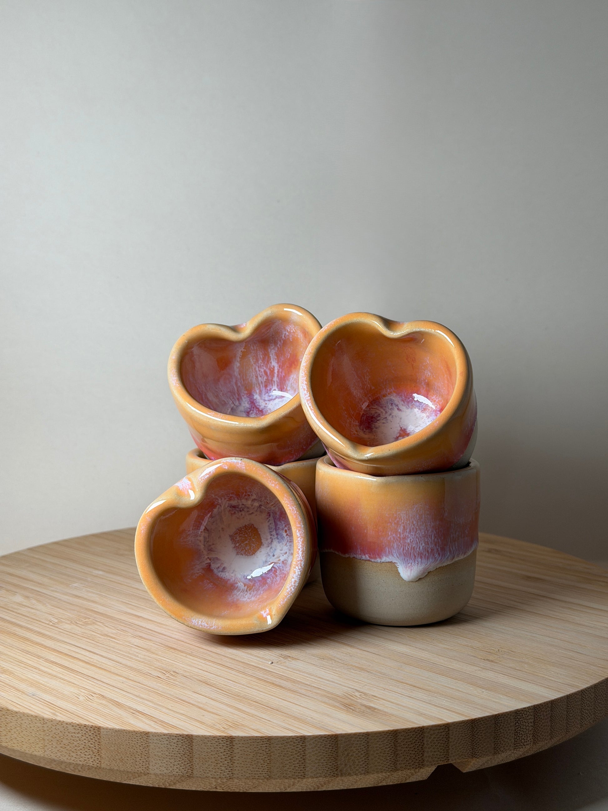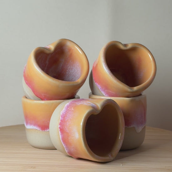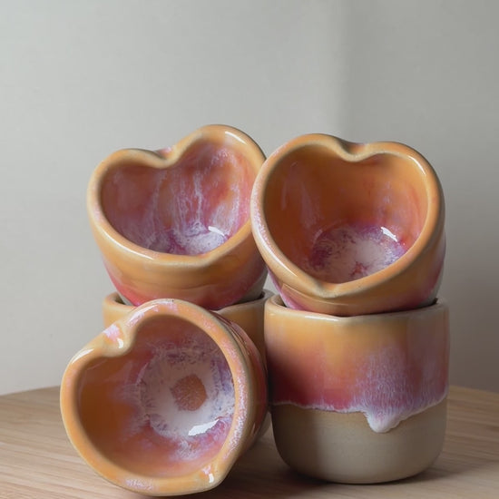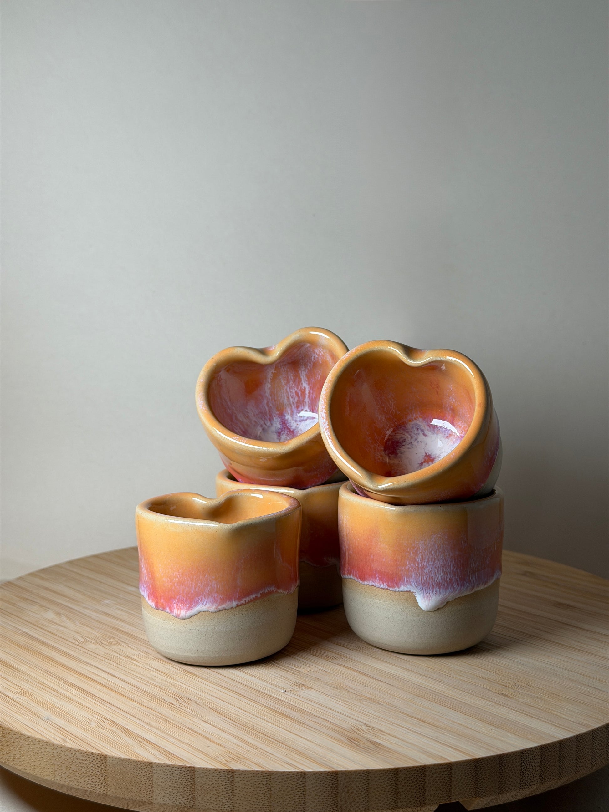 Jeder meiner Espressobecher wird mit viel Liebe und Präzision auf der Drehscheibe aus hellem Steinzeug gefertigt. Die Glasur „Girasole“ strahlt in warmen Gelb- und Rosatönen und erinnert an das Leuchten einer Sonnenblume im Abendlicht – sonnig, verspielt und voller Lebensfreude.