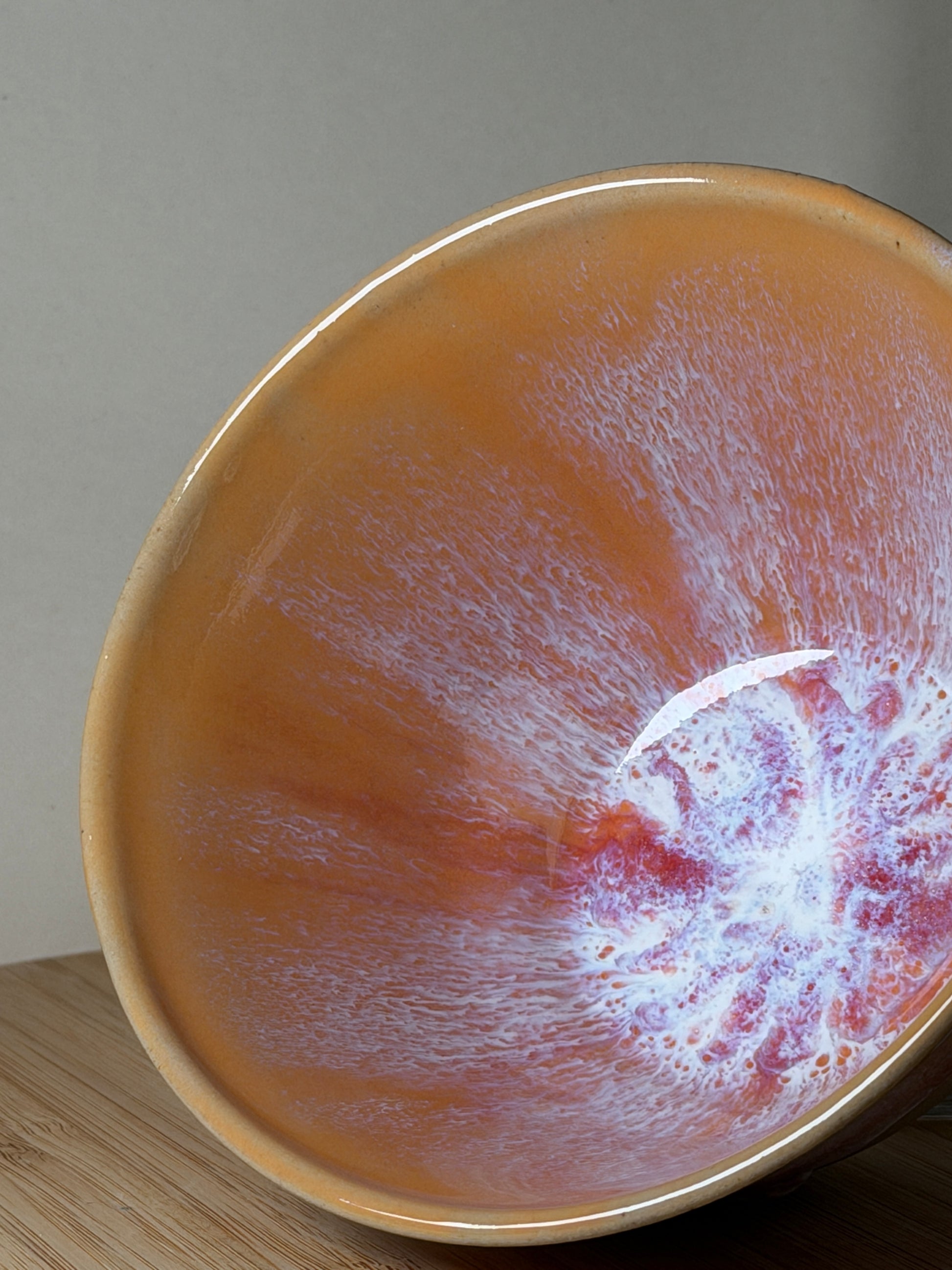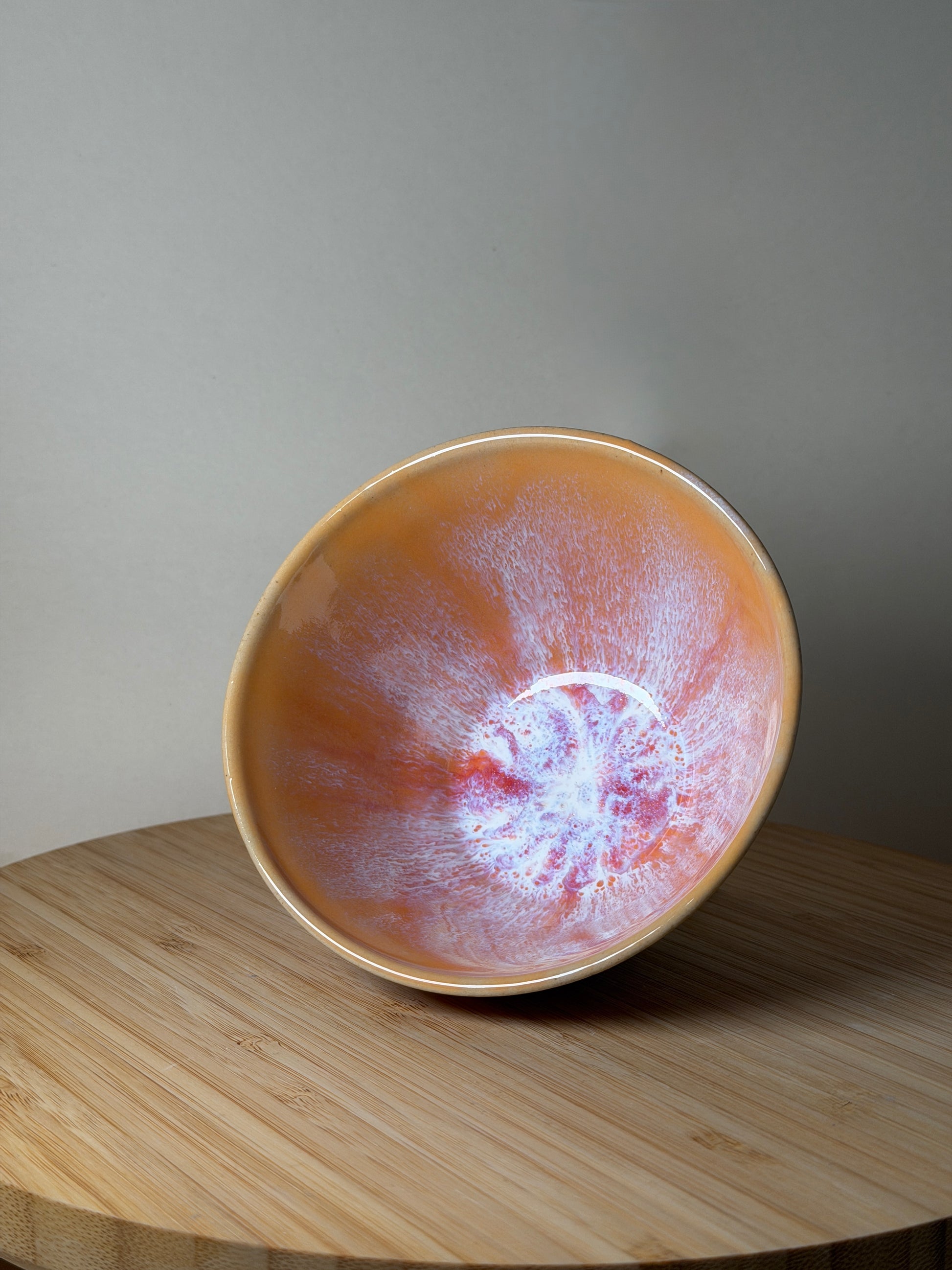 Jede meiner Schalen wird mit viel Liebe und Präzision auf der Drehscheibe aus hellem Steinzeug gefertigt. Die Glasur „Girasole“ strahlt in warmen Gelb- und Rosatönen und erinnert an das Leuchten einer Sonnenblume im Abendlicht – sonnig, lebendig und voller Wärme.