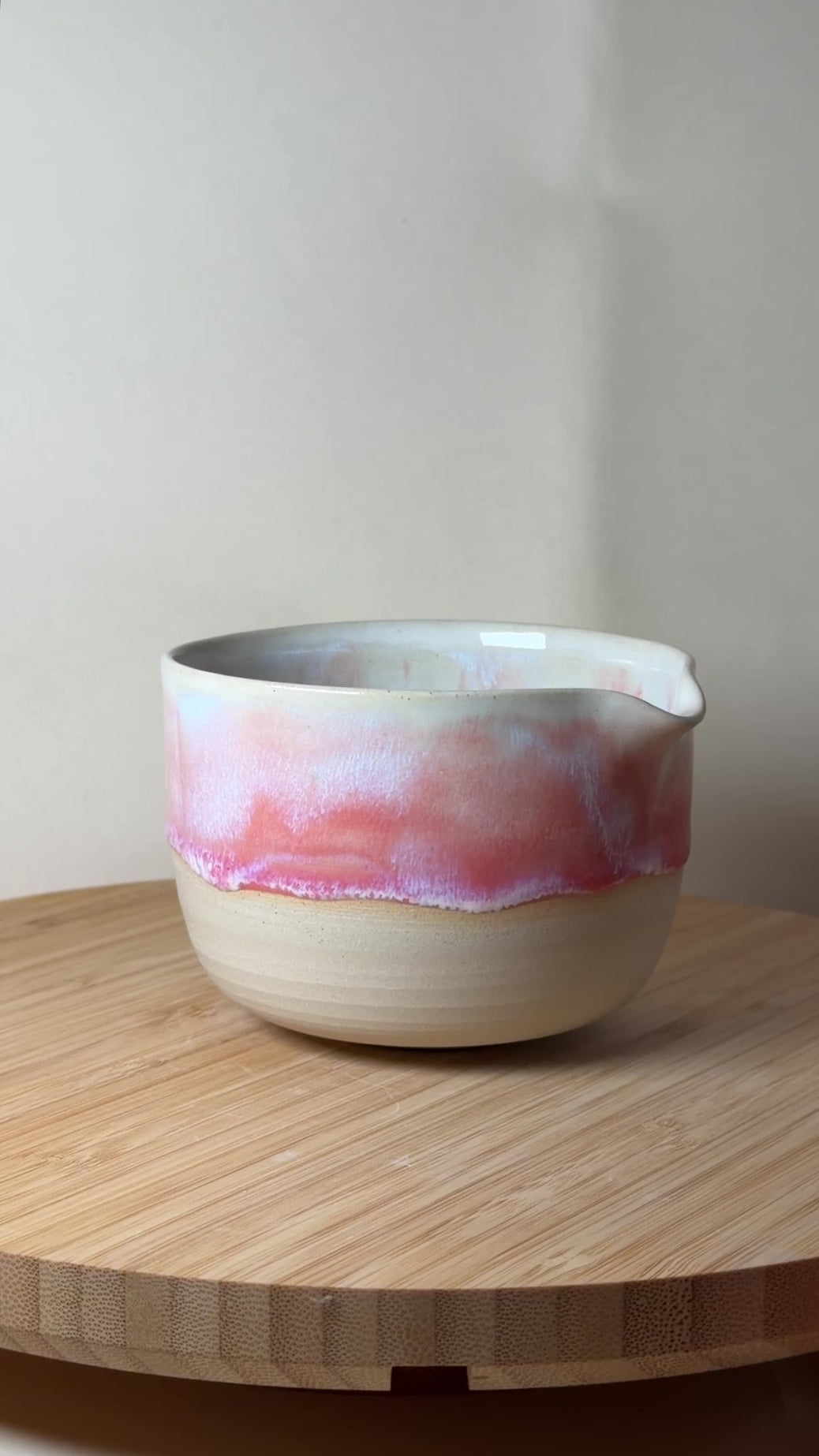 Jede meiner Matchaschalen wird mit viel Liebe und Sorgfalt auf der Drehscheibe aus hellem Steinzeug gefertigt. Die Glasur „Magnolia“ verbindet zarte Weiß- und Rosatöne und erinnert an die ersten Blüten des Frühlings – elegant, sanft und zeitlos schön.